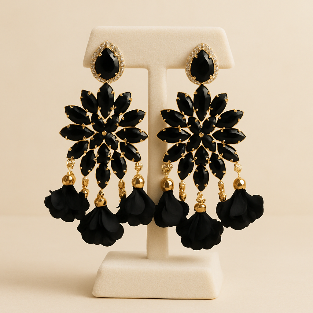 Dramatic black petals meet golden accents in a bold floral design. Finished with delicate black tassel blooms, these statement earrings whisper mystery and sophistication, perfect for the woman who owns the night.